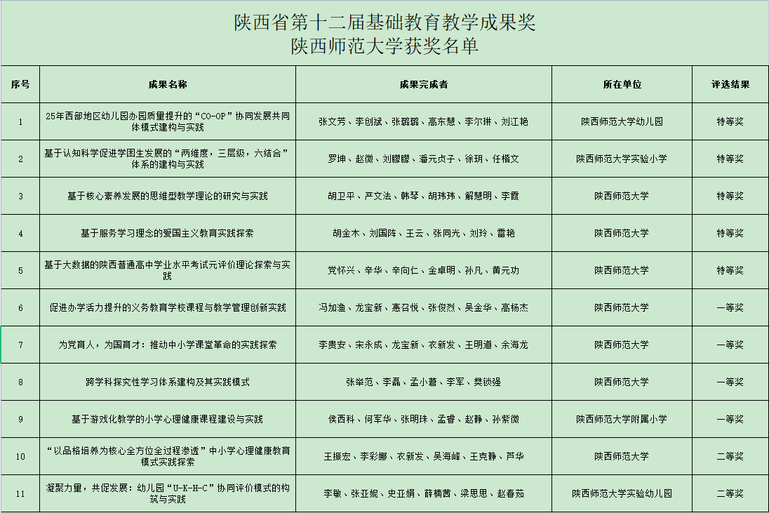 5月12日,陕西省教育厅发布《陕西省教育厅 陕西省人力资源和社会保障厅关于公布陕西省第十二届基础教育教学成果奖评审结果的通知》,我校共有11项成果获奖,其中,特等奖5项,一等奖4项,二等奖2项,获奖数量与等级均达到新高。